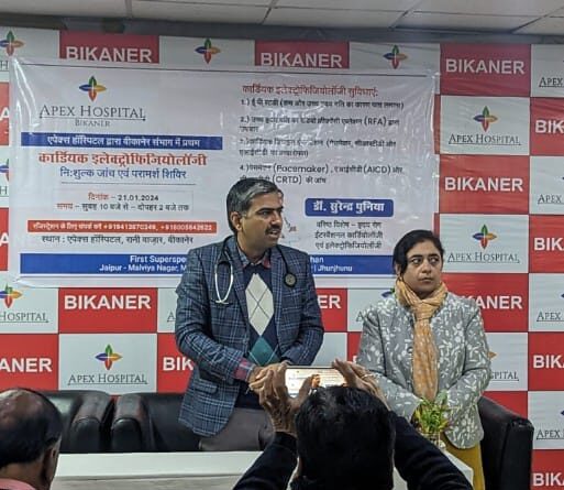 मेडिकल सुपरिंटेंडेंट डॉक्टर गुरजीत कौर ने बताया कि एपेक्स हॉस्पिटल, बीकानेर एवं उत्तरी राजस्थान का पहला एवं एकमात्र प्राइवेट हॉस्पिटल है जहां कार्डियक इलेक्ट्रॉफिजियोलॉजी की नियमित सुविधाएं शुरू की गई हैं। उन्होंने बताया कि बताया कि 20 एवं 21 जनवरी, समय सुबह 10 से दोपहर 2 बजे तक एपेक्स हॉस्पिटल में कैंप का आयोजन किया जाएगा जिसके अंतर्गत हार्ट की धड़कन से सम्बंधित बीमारी के मरीजों की जांच व ईसीजी फ्री की जाएगी एवं जिनके पेसमेकर, सीआरटी, एआइसीडी मशीन लगी हुई है उनकी मशीन की जांच भी फ्री की जाएगी। सेल्स एंड मार्केटिंग हेड नवीन मुद्गल ने बताया कि इस कैंप का प्रचार प्रसार आसपास के गांव जैसे डूंगरगढ़ रतनगढ़ सूरतगढ़ हनुमानगढ़, गंगानगर में भी किया गया है, जिससे ज्यादा से ज्यादा लोग इसका फायदा ले सके।