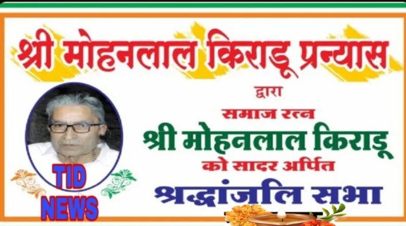 स्व. मोहनलाल किराडू की तृतीय पुण्यतिथि पर श्रद्धांजलि सभा 31 को