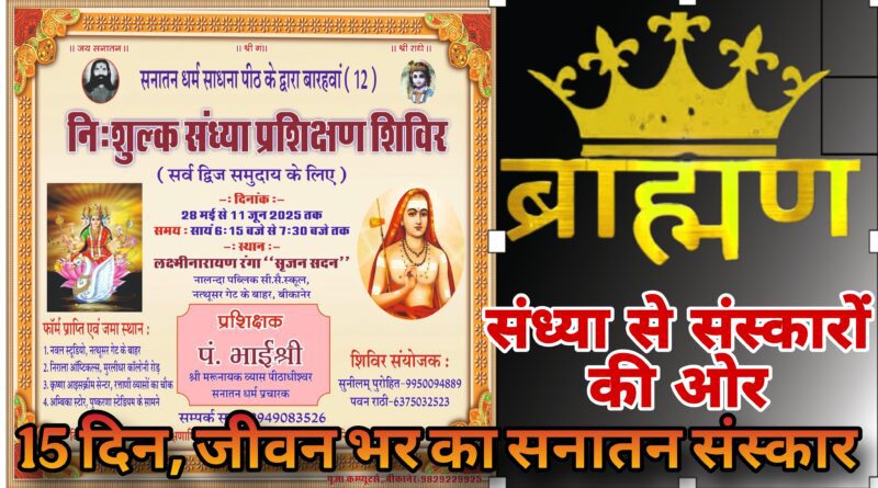 बीकानेर। सनातन धर्म साधना पीठ के तत्वावधान में आगामी 28 मई से 11 जून तक 15 दिवसीय बारहवाँ नि:शुल्क संध्या प्रशिक्षण शिविर आयोजित किया जाएगा। यह शिविर लक्ष्मीनारायण रंगा “सृजन सदन”, नत्थूसर गेट पर प्रतिदिन शाम 6:15 बजे से 7:30 बजे तक आयोजित होगा।कार्यक्रम संयोजक सुनीलम् व पवन राठी ने जानकारी देते हुए बताया कि यह संस्था का बारहवाँ नि:शुल्क प्रशिक्षण शिविर है, जिसमें सनातन धर्म प्रचारक पंडित भाईश्री प्रशिक्षण प्रदान करेंगे।
