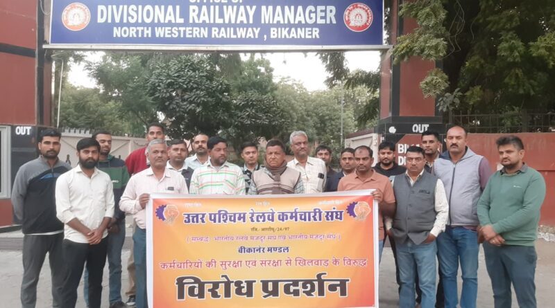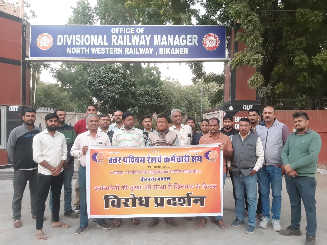बीकानेर। लालगढ़ स्टेशन पर 16 नवंबर को ड्यूटी के दौरान शंटिंग करते समय पॉइंट्समैन अभिमन्यु सिंह के ट्रेन की चपेट में आने से दर्दनाक मौत हो गई। इस घटना को लेकर उत्तर पश्चिम रेलवे कर्मचारी संघ ने सोमवार 17 नवंबर को मंडल रेल प्रबंधक कार्यालय के प्रवेश द्वार पर जोरदार विरोध प्रदर्शन किया।