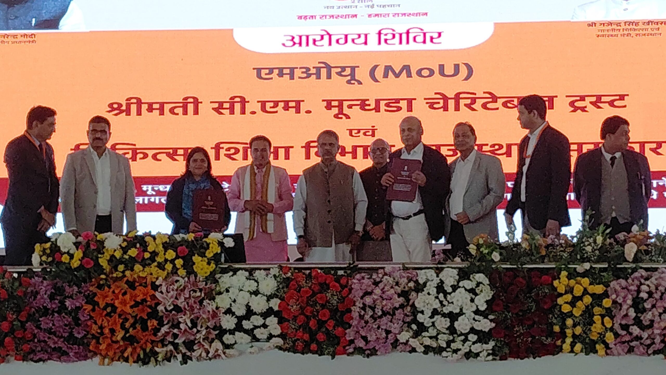मुख्यमंत्री भजनलाल शर्मा की अध्यक्षता में आयोजित राज्यस्तरीय आरोग्य शिविर में राज्य सरकार के चिकित्सा मंत्री गजेंद्र सिंह खींवसर , मंत्री जोगाराम पटेल, प्रमुख शासन सचिव चिकित्सा एवं स्वास्थ्य गायित्री राठौड़, आयुक्त चिकित्सा शिक्षा विभाग नरेश गोयल व श्रीमती सी एम मूंधड़ा मेमोरियल चेरिटेबल ट्रस्ट के मुख्य ट्रस्टी कन्हैयालाल मूंधड़ा व देवकिशन मूंधड़ा के मध्य आरयूएचएस जयपुर में एमओयू किया गया ।