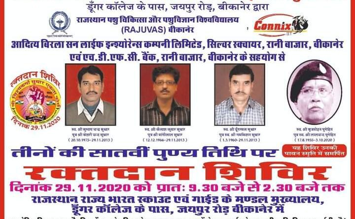 बीकानेर 19 नवम्बर 2020। राजस्थान राज्य भारत स्काउट व गाइड स्थानीय संघ बीकानेर के द्वारा स्व. श्री सुभाष चन्द्र सुथार, स्व. श्री कैलाष चन्द्र सुथार, एवं स्व. श्री डुंगरमल सुथार की स्मृति में 07 वां रक्तदान शिविर का आयोजन 29 नवम्बर को किया जायेगा। शिविर पूर्व स्थानीय संघ सचिव बृजमोहन पुरोहित को सर्मपित होगा। भारत स्काउट व गाइड के मण्डल मुख्यालय जयपुर रोड के सभागार में रक्तदान सुबह 09 से दोपहर 2.30 बजे तक किया जायेगा।