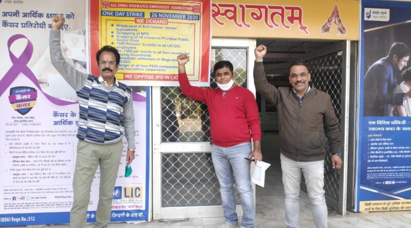 बीकानेर। केन्द्रीय श्रम सगठनों के देशव्यापी हड़ताल के समर्थन में आल इंडिया इंश्योरेंस एम्लाइज एसोसिएशन के आहवान पर बीकानेर के बीमाकर्मी एक दिन की हड़ताल पर रहें। भारतीय जीवन बीमा निगम के बीकानेर मण्डल के अन्तर्गत बीकानेर, नागौर, चुरू, श्रीगंगानगर एवं हनुमानगढ जिलों की समस्त शाखा इकाईयों व मण्डल कार्यालय में कार्यरत तृतीय एवं चतुर्थ श्रेणी के कर्मचारीयों ने संगठन के आहवान पर 26 नवम्बर को एक दिन की हड़ताल का सफल आयोजन किया। इस दौरान कर्मचारियों ने कार्य का बहिष्कार किया। कर्मचारियों ने विभिन्न मांगों व सरकार की श्रम विरोधी नीतियों के खिलाफ हडताल के माध्यम से रोष प्रकट किया।